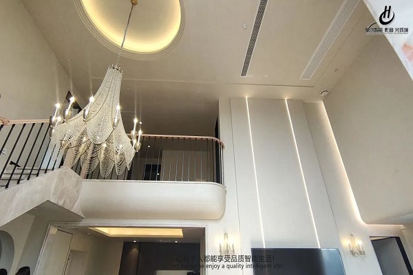 回家模式:進門處放置了一塊河東智能開關面板,一鍵進入回家模式,燈光緩緩亮起,逐層打開,射燈、燈帶調為暖色調,背景音樂響起,迎接你的不再是冷漠的家,而是溫馨溫暖的家。